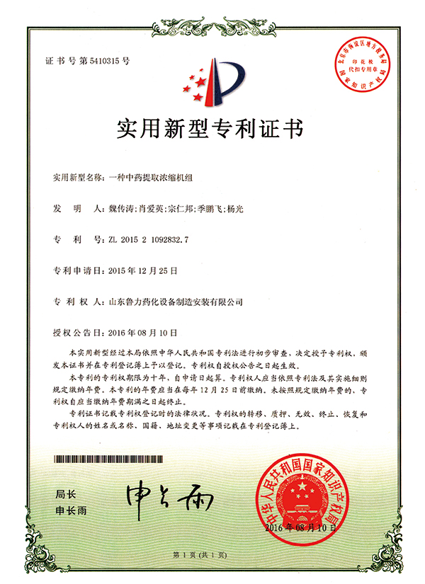 Patent certificate of traditional Chinese medicine extraction and concentration system