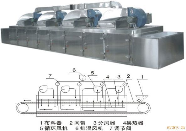 DW系列多層帶式干燥機(jī)是成批生產(chǎn)用的連續(xù)式干燥設(shè)備,用于透氣性較好的片狀、條狀、顆粒狀物料的干燥,對(duì)于脫水蔬菜、催化劑、中藥飲片等類含水率高、而溫度不允許高的物料尤為合適;該系列干燥機(jī)具有干燥速度快、蒸發(fā)強(qiáng)度高、產(chǎn)品質(zhì)量好的優(yōu)點(diǎn),對(duì)脫水濾餅狀的膏狀物料,需經(jīng)造粒或制成條狀后方可干燥。