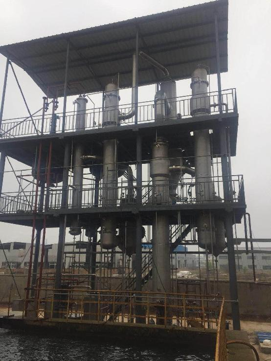 三效外循環蒸發器通入物料后,物料通過蒸發器頂部經料液分配裝置均勻的流入各蒸發管內,物料在地心引力也就是重力的作用下,沿著蒸發管內壁液膜狀由上而下流動,在下降過程中會與蒸發管外壁加熱蒸汽發生熱交換從而形成薄膜蒸發工藝。而且因為二次蒸汽的流向是一樣的,所以對料液在內壁向下運動已經蒸發起到了促進作用,使得傳熱系數增高,傳熱效率提高。